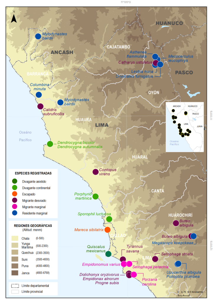 1. Residentes marginales: Especies residentes para las cuales el departamento de Lima se encuentra al margen de su distribución, que solo ocurren en lugares poco visitados dentro del área, o que solo ocurren en números muy reducidos. Por ejemplo, Upucerthia albigula solo es observada en Valle Tinajas, Huarochirí, y en ninguna otra localidad. Como muestra la figura 30, la mayoría de las especies en esta categoría fueron observadas en el norte del departamento.