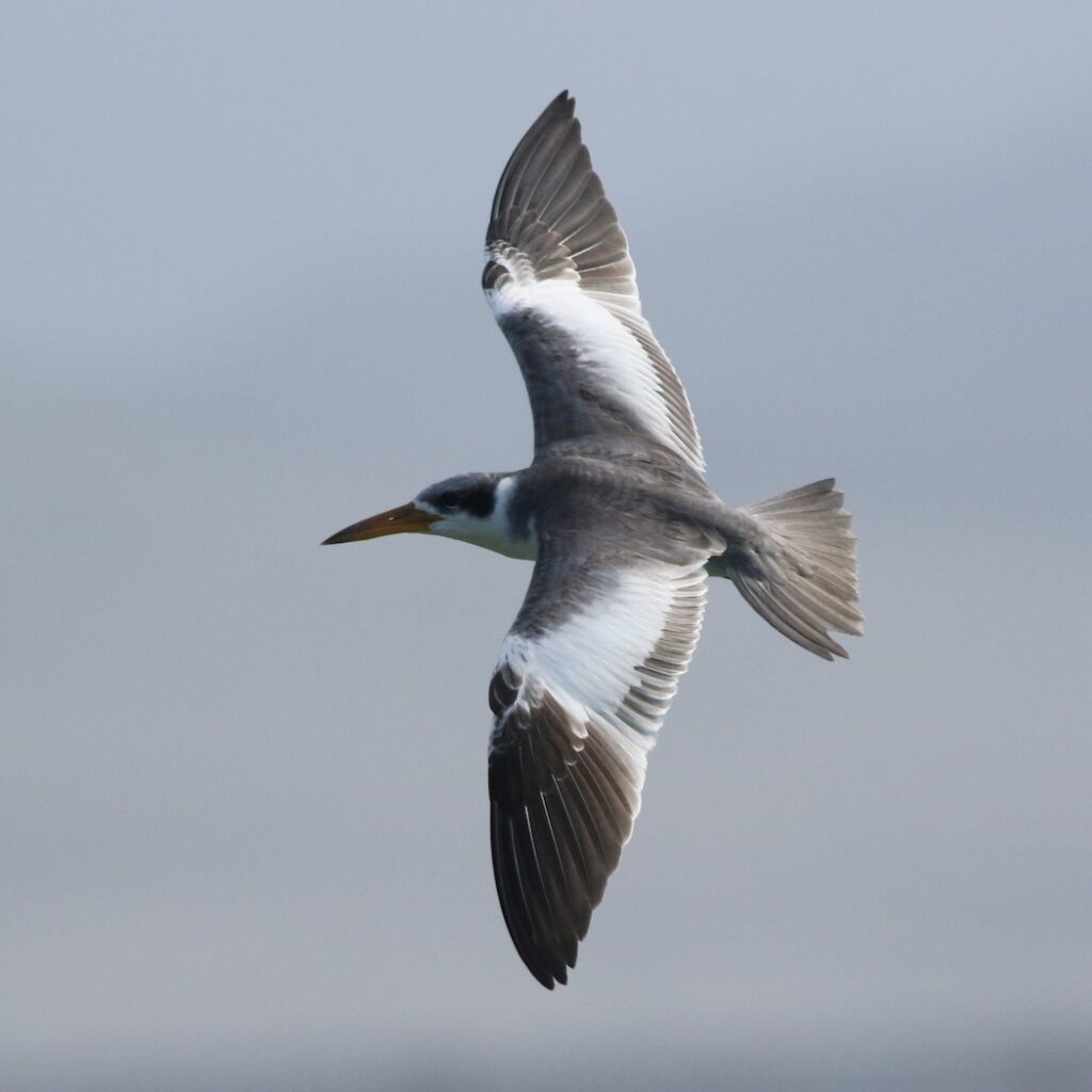 Las fotos muestran un gaviotín con las partes inferiores blancas. Tiene la capucha gris oscura y la espalda, la cola, y las primarias del mismo color. En la parte superior del ala tiene un parche blanco grande. El pico es naranja lavado con gris, bastante largo y grueso en comparación con otros gaviotines. El registro fue aceptado por unanimidad.