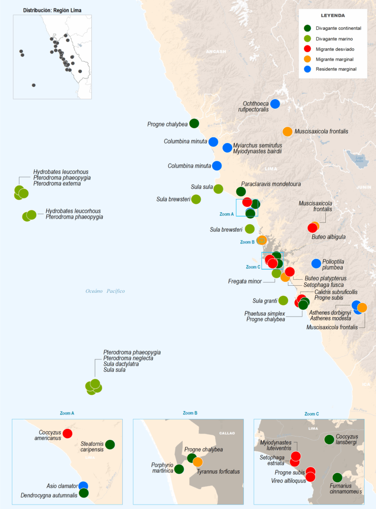 - Migrantes desviados: Especies migratorias cuya ruta de migración habitual no pasa por el departamento de Lima. Entre los migrantes hay individuos que se desvían por el lado ‘equivocado’ de los Andes, pasando por la costa en vez de la selva o ceja de selva.
